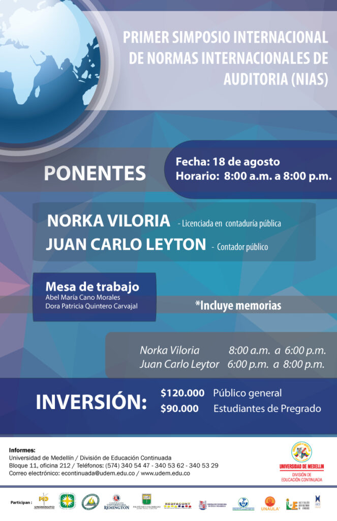 REDFACONT, a través del Programa de Contaduría Pública de la Universidad de Medellín, se complace en convocar a toda la comunidad a participar en el Seminario Internacional sobre NIAS, a realizarse en la ciudad de Medellín, el 18 de agosto de 2015 de 8:00 a.m. A 8:00 p.m.